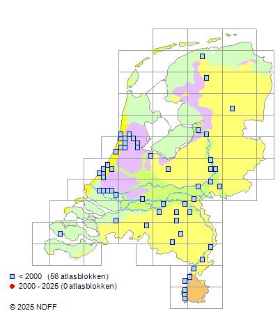 Het aantal atlasblokken (5x5 km) waarin de soort is gemeld binnen een periode van vijf jaar (vanaf 1980) of twintig jaar. Niet gecorrigeerd voor waarnemersinspanning en het aantal doorgegeven waarnemingen kan sterk variëren per periode, dus een trend in verspreiding kan hier niet direct uit worden afgelezen. Het opgegeven jaartal is het eerste jaar van de periode. Bron: gevalideerde waarnemingen uit de NDFF.