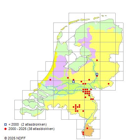 Het aantal atlasblokken (5x5 km) waarin de soort is gemeld binnen een periode van vijf jaar (vanaf 1980) of twintig jaar. Niet gecorrigeerd voor waarnemersinspanning en het aantal doorgegeven waarnemingen kan sterk variëren per periode, dus een trend in verspreiding kan hier niet direct uit worden afgelezen. Het opgegeven jaartal is het eerste jaar van de periode. Bron: gevalideerde waarnemingen uit de NDFF.