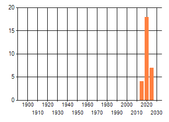 Het aantal atlasblokken (5x5 km) waarin de soort is gemeld binnen een periode van vijf jaar (vanaf 1980) of twintig jaar. Niet gecorrigeerd voor waarnemersinspanning en het aantal doorgegeven waarnemingen kan sterk variëren per periode, dus een trend in verspreiding kan hier niet direct uit worden afgelezen. Het opgegeven jaartal is het eerste jaar van de periode. Bron: gevalideerde waarnemingen uit de NDFF.