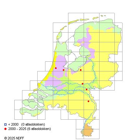 Het aantal atlasblokken (5x5 km) waarin de soort is gemeld binnen een periode van vijf jaar (vanaf 1980) of twintig jaar. Niet gecorrigeerd voor waarnemersinspanning en het aantal doorgegeven waarnemingen kan sterk variëren per periode, dus een trend in verspreiding kan hier niet direct uit worden afgelezen. Het opgegeven jaartal is het eerste jaar van de periode. Bron: gevalideerde waarnemingen uit de NDFF.