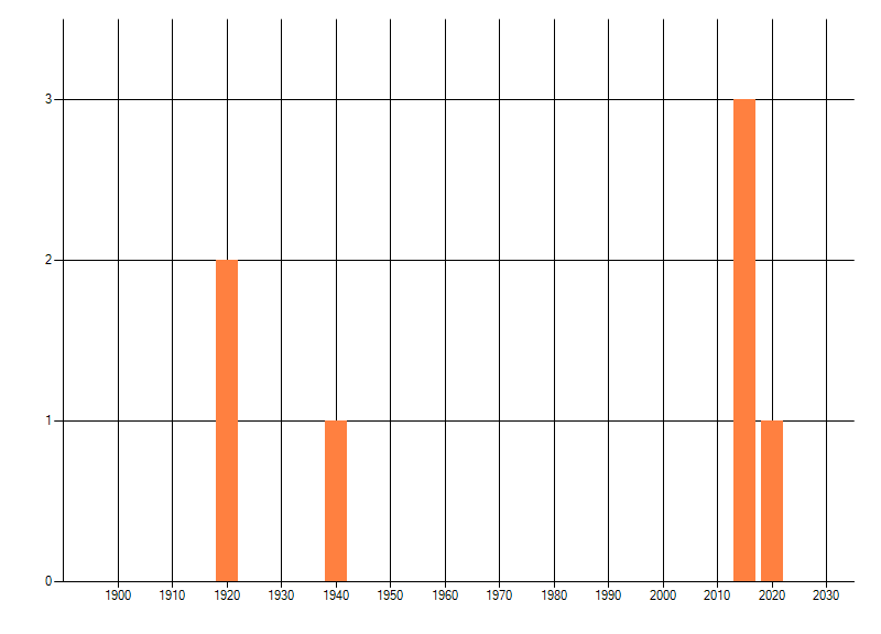 Het aantal atlasblokken (5x5 km) waarin de soort is gemeld binnen een periode van vijf jaar (vanaf 1980) of twintig jaar. Niet gecorrigeerd voor waarnemersinspanning en het aantal doorgegeven waarnemingen kan sterk variëren per periode, dus een trend in verspreiding kan hier niet direct uit worden afgelezen. Het opgegeven jaartal is het eerste jaar van de periode. Bron: gevalideerde waarnemingen uit de NDFF.