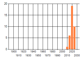 Het aantal atlasblokken (5x5 km) waarin de soort is gemeld binnen een periode van vijf jaar (vanaf 1980) of twintig jaar. Niet gecorrigeerd voor waarnemersinspanning en het aantal doorgegeven waarnemingen kan sterk variëren per periode, dus een trend in verspreiding kan hier niet direct uit worden afgelezen. Het opgegeven jaartal is het eerste jaar van de periode. Bron: gevalideerde waarnemingen uit de NDFF.