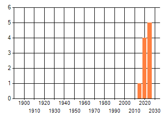 Het aantal atlasblokken (5x5 km) waarin de soort is gemeld binnen een periode van vijf jaar (vanaf 1980) of twintig jaar. Niet gecorrigeerd voor waarnemersinspanning en het aantal doorgegeven waarnemingen kan sterk variëren per periode, dus een trend in verspreiding kan hier niet direct uit worden afgelezen. Het opgegeven jaartal is het eerste jaar van de periode. Bron: gevalideerde waarnemingen uit de NDFF.