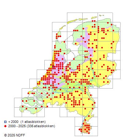 Het aantal atlasblokken (5x5 km) waarin de soort is gemeld binnen een periode van vijf jaar (vanaf 1980) of twintig jaar. Niet gecorrigeerd voor waarnemersinspanning en het aantal doorgegeven waarnemingen kan sterk variëren per periode, dus een trend in verspreiding kan hier niet direct uit worden afgelezen. Het opgegeven jaartal is het eerste jaar van de periode. Bron: gevalideerde waarnemingen uit de NDFF.