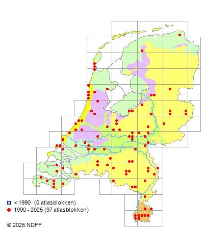 Het aantal atlasblokken (5x5 km) waarin de soort is gemeld binnen een periode van vijf jaar (vanaf 1980) of twintig jaar. Niet gecorrigeerd voor waarnemersinspanning en het aantal doorgegeven waarnemingen kan sterk variëren per periode, dus een trend in verspreiding kan hier niet direct uit worden afgelezen. Het opgegeven jaartal is het eerste jaar van de periode. Bron: gevalideerde waarnemingen uit de NDFF.