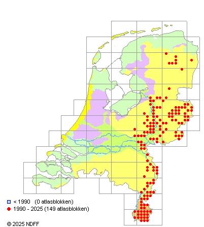 Het aantal atlasblokken (5x5 km) waarin de soort is gemeld binnen een periode van vijf jaar (vanaf 1980) of twintig jaar. Niet gecorrigeerd voor waarnemersinspanning en het aantal doorgegeven waarnemingen kan sterk variëren per periode, dus een trend in verspreiding kan hier niet direct uit worden afgelezen. Het opgegeven jaartal is het eerste jaar van de periode. Bron: gevalideerde waarnemingen uit de NDFF.