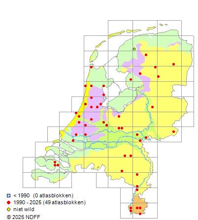Het aantal atlasblokken (5x5 km) waarin de soort is gemeld binnen een periode van vijf jaar (vanaf 1980) of twintig jaar. Niet gecorrigeerd voor waarnemersinspanning en het aantal doorgegeven waarnemingen kan sterk variëren per periode, dus een trend in verspreiding kan hier niet direct uit worden afgelezen. Het opgegeven jaartal is het eerste jaar van de periode. Bron: gevalideerde waarnemingen uit de NDFF.
