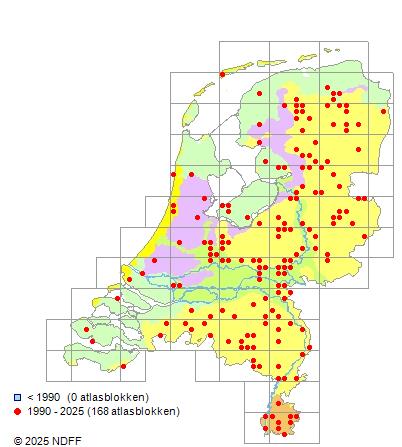 Het aantal atlasblokken (5x5 km) waarin de soort is gemeld binnen een periode van vijf jaar (vanaf 1980) of twintig jaar. Niet gecorrigeerd voor waarnemersinspanning en het aantal doorgegeven waarnemingen kan sterk variëren per periode, dus een trend in verspreiding kan hier niet direct uit worden afgelezen. Het opgegeven jaartal is het eerste jaar van de periode. Bron: gevalideerde waarnemingen uit de NDFF.