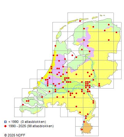 Het aantal atlasblokken (5x5 km) waarin de soort is gemeld binnen een periode van vijf jaar (vanaf 1980) of twintig jaar. Niet gecorrigeerd voor waarnemersinspanning en het aantal doorgegeven waarnemingen kan sterk variëren per periode, dus een trend in verspreiding kan hier niet direct uit worden afgelezen. Het opgegeven jaartal is het eerste jaar van de periode. Bron: gevalideerde waarnemingen uit de NDFF.