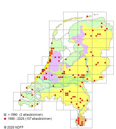 Het aantal atlasblokken (5x5 km) waarin de soort is gemeld binnen een periode van vijf jaar (vanaf 1980) of twintig jaar. Niet gecorrigeerd voor waarnemersinspanning en het aantal doorgegeven waarnemingen kan sterk variëren per periode, dus een trend in verspreiding kan hier niet direct uit worden afgelezen. Het opgegeven jaartal is het eerste jaar van de periode. Bron: gevalideerde waarnemingen uit de NDFF.