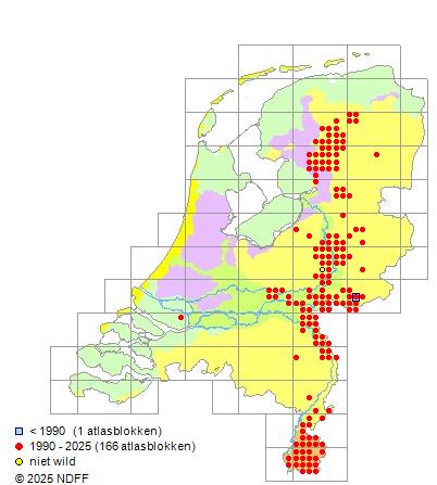 Het aantal atlasblokken (5x5 km) waarin de soort is gemeld binnen een periode van vijf jaar (vanaf 1980) of twintig jaar. Niet gecorrigeerd voor waarnemersinspanning en het aantal doorgegeven waarnemingen kan sterk variëren per periode, dus een trend in verspreiding kan hier niet direct uit worden afgelezen. Het opgegeven jaartal is het eerste jaar van de periode. Bron: gevalideerde waarnemingen uit de NDFF.