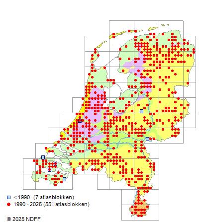 Het aantal atlasblokken (5x5 km) waarin de soort is gemeld binnen een periode van vijf jaar (vanaf 1980) of twintig jaar. Niet gecorrigeerd voor waarnemersinspanning en het aantal doorgegeven waarnemingen kan sterk variëren per periode, dus een trend in verspreiding kan hier niet direct uit worden afgelezen. Het opgegeven jaartal is het eerste jaar van de periode. Bron: gevalideerde waarnemingen uit de NDFF.