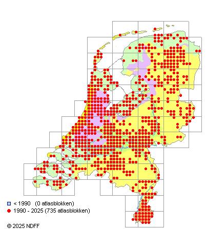 Het aantal atlasblokken (5x5 km) waarin de soort is gemeld binnen een periode van vijf jaar (vanaf 1980) of twintig jaar. Niet gecorrigeerd voor waarnemersinspanning en het aantal doorgegeven waarnemingen kan sterk variëren per periode, dus een trend in verspreiding kan hier niet direct uit worden afgelezen. Het opgegeven jaartal is het eerste jaar van de periode. Bron: gevalideerde waarnemingen uit de NDFF.