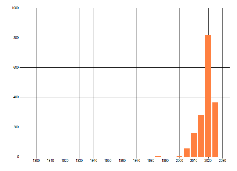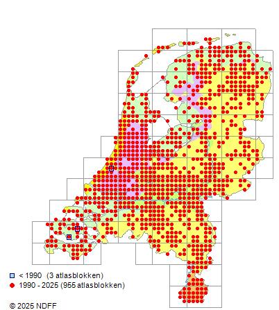 Het aantal atlasblokken (5x5 km) waarin de soort is gemeld binnen een periode van vijf jaar (vanaf 1980) of twintig jaar. Niet gecorrigeerd voor waarnemersinspanning en het aantal doorgegeven waarnemingen kan sterk variëren per periode, dus een trend in verspreiding kan hier niet direct uit worden afgelezen. Het opgegeven jaartal is het eerste jaar van de periode. Bron: gevalideerde waarnemingen uit de NDFF.