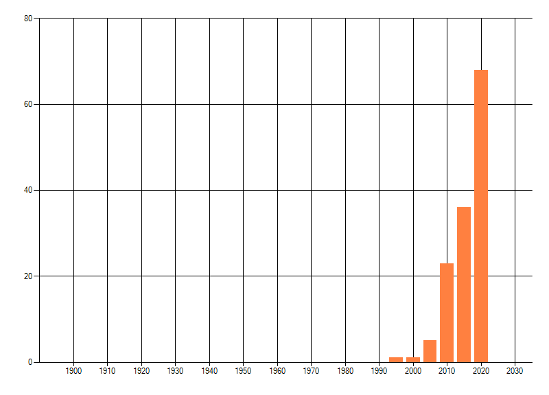 Het aantal atlasblokken (5x5 km) waarin de soort is gemeld binnen een periode van vijf jaar (vanaf 1980) of twintig jaar. Niet gecorrigeerd voor waarnemersinspanning en het aantal doorgegeven waarnemingen kan sterk variëren per periode, dus een trend in verspreiding kan hier niet direct uit worden afgelezen. Het opgegeven jaartal is het eerste jaar van de periode. Bron: gevalideerde waarnemingen uit de NDFF.