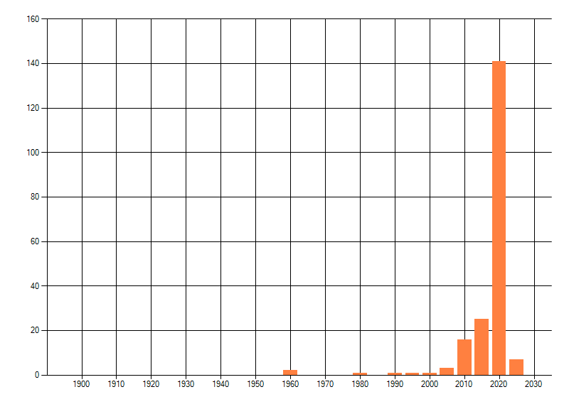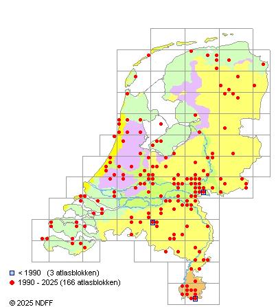 Het aantal atlasblokken (5x5 km) waarin de soort is gemeld binnen een periode van vijf jaar (vanaf 1980) of twintig jaar. Niet gecorrigeerd voor waarnemersinspanning en het aantal doorgegeven waarnemingen kan sterk variëren per periode, dus een trend in verspreiding kan hier niet direct uit worden afgelezen. Het opgegeven jaartal is het eerste jaar van de periode. Bron: gevalideerde waarnemingen uit de NDFF.