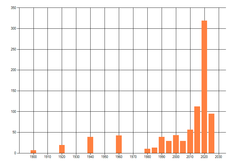 Het aantal atlasblokken (5x5 km) waarin de soort is gemeld binnen een periode van vijf jaar (vanaf 1980) of twintig jaar. Niet gecorrigeerd voor waarnemersinspanning en het aantal doorgegeven waarnemingen kan sterk variëren per periode, dus een trend in verspreiding kan hier niet direct uit worden afgelezen. Het opgegeven jaartal is het eerste jaar van de periode. Bron: gevalideerde waarnemingen uit de NDFF.