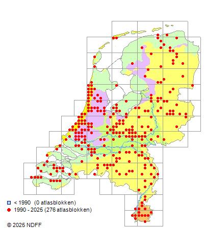 Het aantal atlasblokken (5x5 km) waarin de soort is gemeld binnen een periode van vijf jaar (vanaf 1980) of twintig jaar. Niet gecorrigeerd voor waarnemersinspanning en het aantal doorgegeven waarnemingen kan sterk variëren per periode, dus een trend in verspreiding kan hier niet direct uit worden afgelezen. Het opgegeven jaartal is het eerste jaar van de periode. Bron: gevalideerde waarnemingen uit de NDFF.