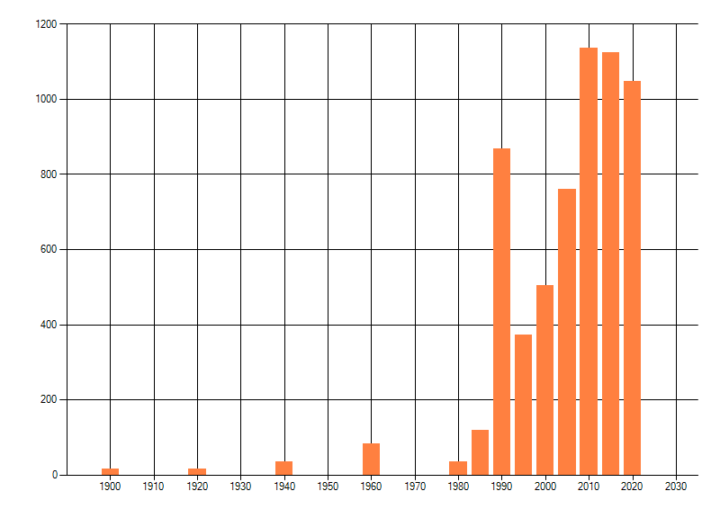 Het aantal atlasblokken (5x5 km) waarin de soort is gemeld binnen een periode van vijf jaar (vanaf 1980) of twintig jaar. Niet gecorrigeerd voor waarnemersinspanning en het aantal doorgegeven waarnemingen kan sterk variëren per periode, dus een trend in verspreiding kan hier niet direct uit worden afgelezen. Het opgegeven jaartal is het eerste jaar van de periode. Bron: gevalideerde waarnemingen uit de NDFF.