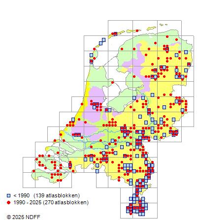 Het aantal atlasblokken (5x5 km) waarin de soort is gemeld binnen een periode van vijf jaar (vanaf 1980) of twintig jaar. Niet gecorrigeerd voor waarnemersinspanning en het aantal doorgegeven waarnemingen kan sterk variëren per periode, dus een trend in verspreiding kan hier niet direct uit worden afgelezen. Het opgegeven jaartal is het eerste jaar van de periode. Bron: gevalideerde waarnemingen uit de NDFF.
