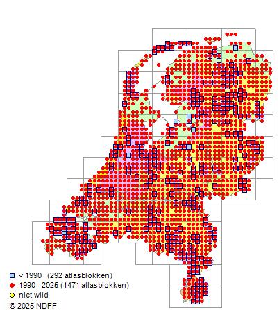 Het aantal atlasblokken (5x5 km) waarin de soort is gemeld binnen een periode van vijf jaar (vanaf 1980) of twintig jaar. Niet gecorrigeerd voor waarnemersinspanning en het aantal doorgegeven waarnemingen kan sterk variëren per periode, dus een trend in verspreiding kan hier niet direct uit worden afgelezen. Het opgegeven jaartal is het eerste jaar van de periode. Bron: gevalideerde waarnemingen uit de NDFF.
