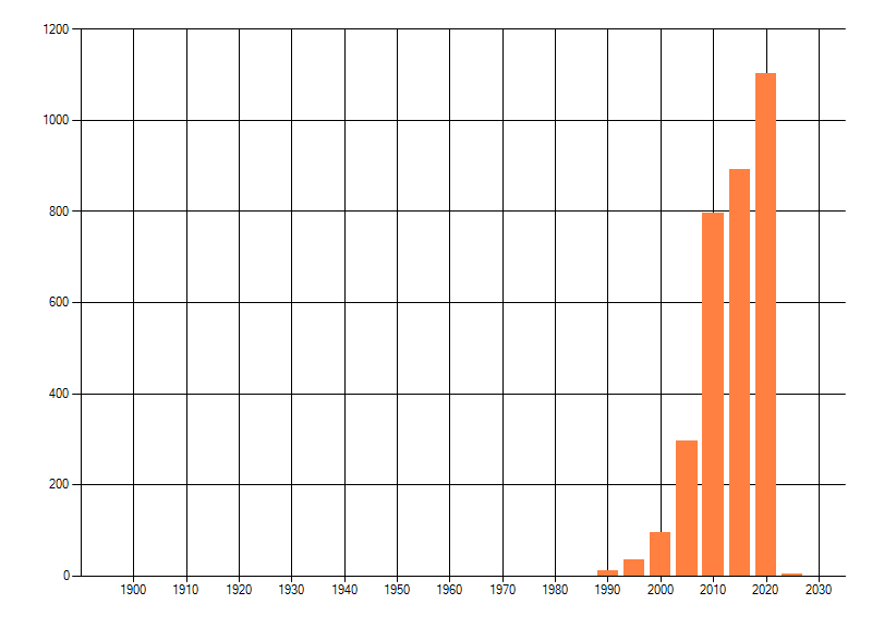 Het aantal atlasblokken (5x5 km) waarin de soort is gemeld binnen een periode van vijf jaar (vanaf 1980) of twintig jaar. Niet gecorrigeerd voor waarnemersinspanning en het aantal doorgegeven waarnemingen kan sterk variëren per periode, dus een trend in verspreiding kan hier niet direct uit worden afgelezen. Het opgegeven jaartal is het eerste jaar van de periode. Bron: gevalideerde waarnemingen uit de NDFF.