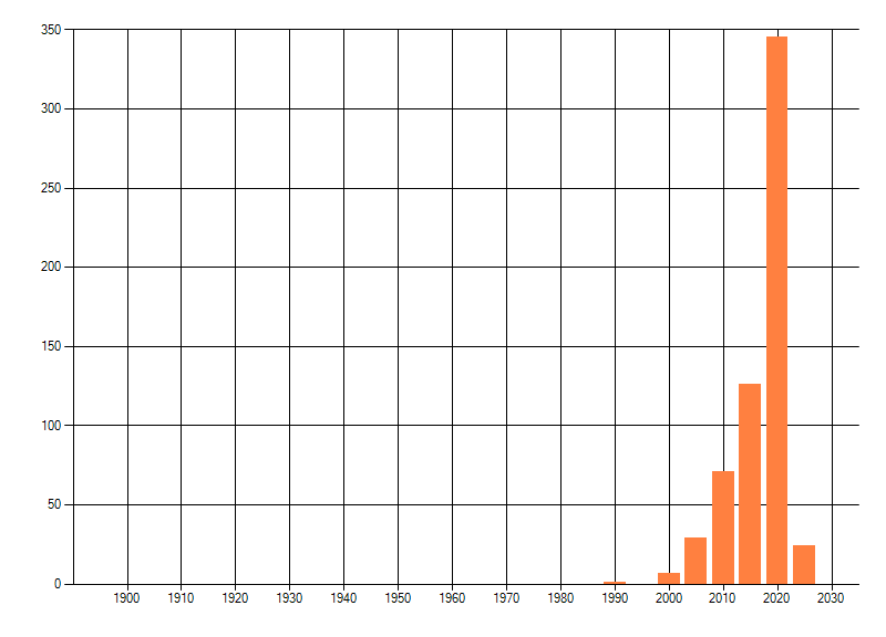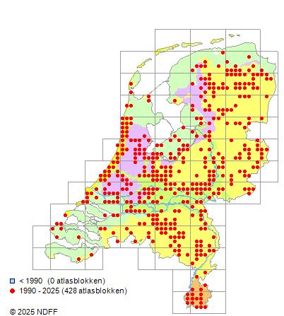 Het aantal atlasblokken (5x5 km) waarin de soort is gemeld binnen een periode van vijf jaar (vanaf 1980) of twintig jaar. Niet gecorrigeerd voor waarnemersinspanning en het aantal doorgegeven waarnemingen kan sterk variëren per periode, dus een trend in verspreiding kan hier niet direct uit worden afgelezen. Het opgegeven jaartal is het eerste jaar van de periode. Bron: gevalideerde waarnemingen uit de NDFF.