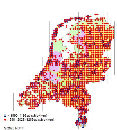 Het aantal atlasblokken (5x5 km) waarin de soort is gemeld binnen een periode van vijf jaar (vanaf 1980) of twintig jaar. Niet gecorrigeerd voor waarnemersinspanning en het aantal doorgegeven waarnemingen kan sterk variëren per periode, dus een trend in verspreiding kan hier niet direct uit worden afgelezen. Het opgegeven jaartal is het eerste jaar van de periode. Bron: gevalideerde waarnemingen uit de NDFF.