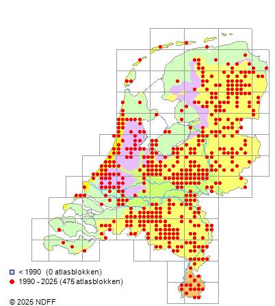 Het aantal atlasblokken (5x5 km) waarin de soort is gemeld binnen een periode van vijf jaar (vanaf 1980) of twintig jaar. Niet gecorrigeerd voor waarnemersinspanning en het aantal doorgegeven waarnemingen kan sterk variëren per periode, dus een trend in verspreiding kan hier niet direct uit worden afgelezen. Het opgegeven jaartal is het eerste jaar van de periode. Bron: gevalideerde waarnemingen uit de NDFF.