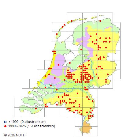 Het aantal atlasblokken (5x5 km) waarin de soort is gemeld binnen een periode van vijf jaar (vanaf 1980) of twintig jaar. Niet gecorrigeerd voor waarnemersinspanning en het aantal doorgegeven waarnemingen kan sterk variëren per periode, dus een trend in verspreiding kan hier niet direct uit worden afgelezen. Het opgegeven jaartal is het eerste jaar van de periode. Bron: gevalideerde waarnemingen uit de NDFF.