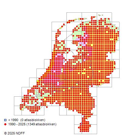 Het aantal atlasblokken (5x5 km) waarin de soort is gemeld binnen een periode van vijf jaar (vanaf 1980) of twintig jaar. Niet gecorrigeerd voor waarnemersinspanning en het aantal doorgegeven waarnemingen kan sterk variëren per periode, dus een trend in verspreiding kan hier niet direct uit worden afgelezen. Het opgegeven jaartal is het eerste jaar van de periode. Bron: gevalideerde waarnemingen uit de NDFF.