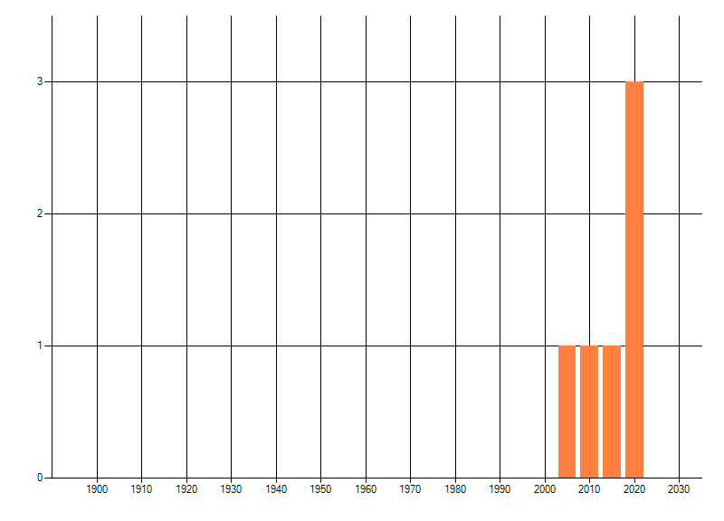 Het aantal atlasblokken (5x5 km) waarin de soort is gemeld binnen een periode van vijf jaar (vanaf 1980) of twintig jaar. Niet gecorrigeerd voor waarnemersinspanning en het aantal doorgegeven waarnemingen kan sterk variëren per periode, dus een trend in verspreiding kan hier niet direct uit worden afgelezen. Het opgegeven jaartal is het eerste jaar van de periode. Bron: gevalideerde waarnemingen uit de NDFF.