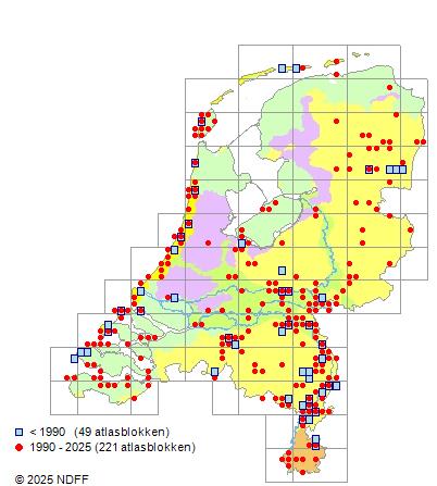 Het aantal atlasblokken (5x5 km) waarin de soort is gemeld binnen een periode van vijf jaar (vanaf 1980) of twintig jaar. Niet gecorrigeerd voor waarnemersinspanning en het aantal doorgegeven waarnemingen kan sterk variëren per periode, dus een trend in verspreiding kan hier niet direct uit worden afgelezen. Het opgegeven jaartal is het eerste jaar van de periode. Bron: gevalideerde waarnemingen uit de NDFF.