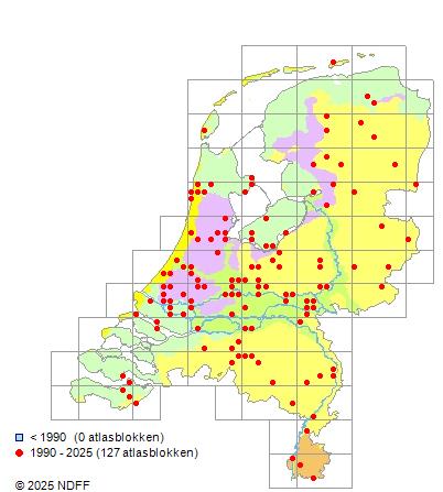 Het aantal atlasblokken (5x5 km) waarin de soort is gemeld binnen een periode van vijf jaar (vanaf 1980) of twintig jaar. Niet gecorrigeerd voor waarnemersinspanning en het aantal doorgegeven waarnemingen kan sterk variëren per periode, dus een trend in verspreiding kan hier niet direct uit worden afgelezen. Het opgegeven jaartal is het eerste jaar van de periode. Bron: gevalideerde waarnemingen uit de NDFF.