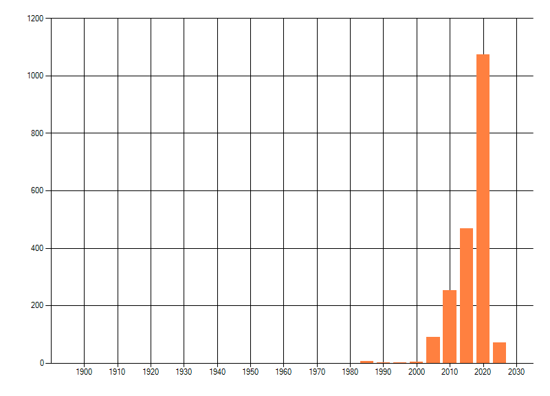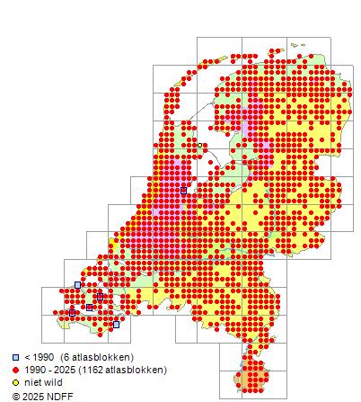 Het aantal atlasblokken (5x5 km) waarin de soort is gemeld binnen een periode van vijf jaar (vanaf 1980) of twintig jaar. Niet gecorrigeerd voor waarnemersinspanning en het aantal doorgegeven waarnemingen kan sterk variëren per periode, dus een trend in verspreiding kan hier niet direct uit worden afgelezen. Het opgegeven jaartal is het eerste jaar van de periode. Bron: gevalideerde waarnemingen uit de NDFF.