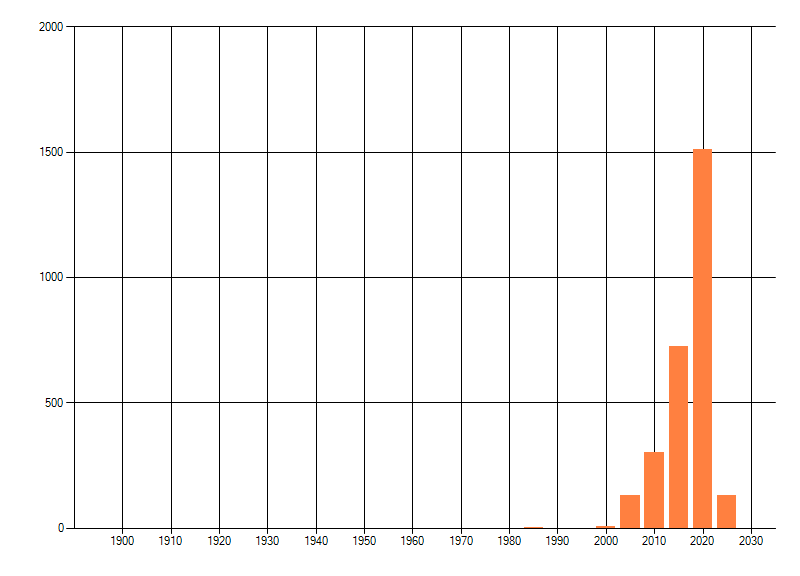 Het aantal atlasblokken (5x5 km) waarin de soort is gemeld binnen een periode van vijf jaar (vanaf 1980) of twintig jaar. Niet gecorrigeerd voor waarnemersinspanning en het aantal doorgegeven waarnemingen kan sterk variëren per periode, dus een trend in verspreiding kan hier niet direct uit worden afgelezen. Het opgegeven jaartal is het eerste jaar van de periode. Bron: gevalideerde waarnemingen uit de NDFF.