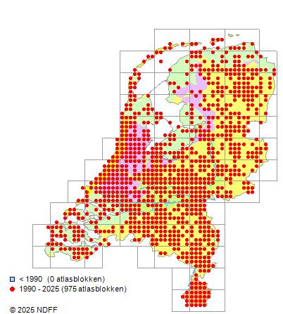 Het aantal atlasblokken (5x5 km) waarin de soort is gemeld binnen een periode van vijf jaar (vanaf 1980) of twintig jaar. Niet gecorrigeerd voor waarnemersinspanning en het aantal doorgegeven waarnemingen kan sterk variëren per periode, dus een trend in verspreiding kan hier niet direct uit worden afgelezen. Het opgegeven jaartal is het eerste jaar van de periode. Bron: gevalideerde waarnemingen uit de NDFF.