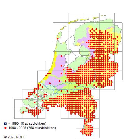 Het aantal atlasblokken (5x5 km) waarin de soort is gemeld binnen een periode van vijf jaar (vanaf 1980) of twintig jaar. Niet gecorrigeerd voor waarnemersinspanning en het aantal doorgegeven waarnemingen kan sterk variëren per periode, dus een trend in verspreiding kan hier niet direct uit worden afgelezen. Het opgegeven jaartal is het eerste jaar van de periode. Bron: gevalideerde waarnemingen uit de NDFF.