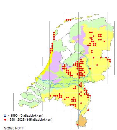 Het aantal atlasblokken (5x5 km) waarin de soort is gemeld binnen een periode van vijf jaar (vanaf 1980) of twintig jaar. Niet gecorrigeerd voor waarnemersinspanning en het aantal doorgegeven waarnemingen kan sterk variëren per periode, dus een trend in verspreiding kan hier niet direct uit worden afgelezen. Het opgegeven jaartal is het eerste jaar van de periode. Bron: gevalideerde waarnemingen uit de NDFF.
