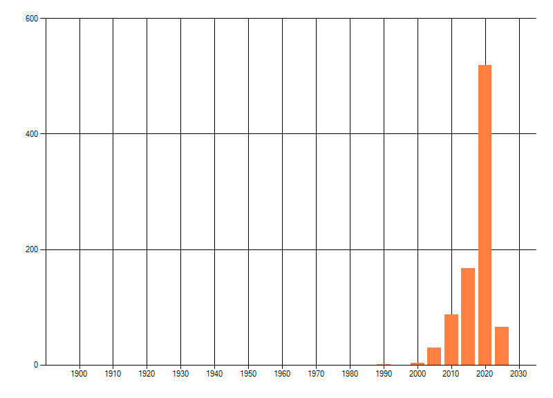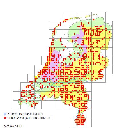 Het aantal atlasblokken (5x5 km) waarin de soort is gemeld binnen een periode van vijf jaar (vanaf 1980) of twintig jaar. Niet gecorrigeerd voor waarnemersinspanning en het aantal doorgegeven waarnemingen kan sterk variëren per periode, dus een trend in verspreiding kan hier niet direct uit worden afgelezen. Het opgegeven jaartal is het eerste jaar van de periode. Bron: gevalideerde waarnemingen uit de NDFF.