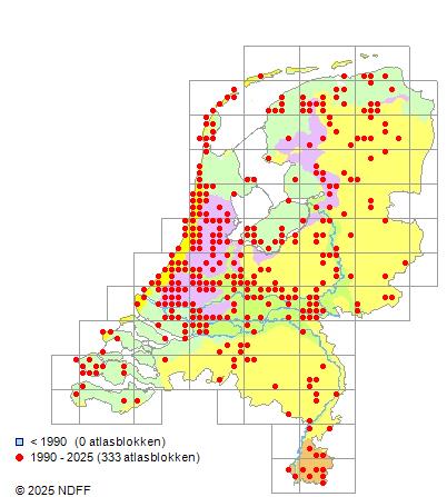 Het aantal atlasblokken (5x5 km) waarin de soort is gemeld binnen een periode van vijf jaar (vanaf 1980) of twintig jaar. Niet gecorrigeerd voor waarnemersinspanning en het aantal doorgegeven waarnemingen kan sterk variëren per periode, dus een trend in verspreiding kan hier niet direct uit worden afgelezen. Het opgegeven jaartal is het eerste jaar van de periode. Bron: gevalideerde waarnemingen uit de NDFF.
