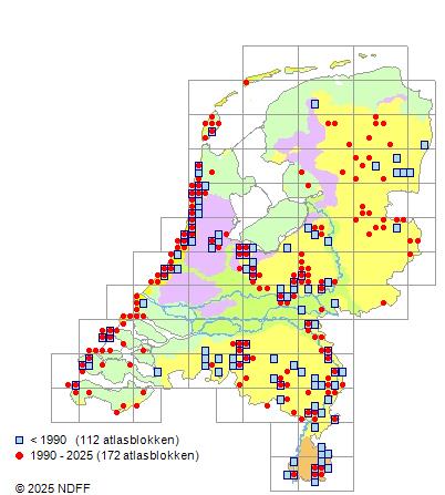Het aantal atlasblokken (5x5 km) waarin de soort is gemeld binnen een periode van vijf jaar (vanaf 1980) of twintig jaar. Niet gecorrigeerd voor waarnemersinspanning en het aantal doorgegeven waarnemingen kan sterk variëren per periode, dus een trend in verspreiding kan hier niet direct uit worden afgelezen. Het opgegeven jaartal is het eerste jaar van de periode. Bron: gevalideerde waarnemingen uit de NDFF.