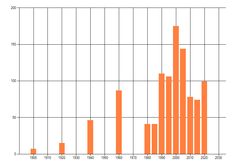 Het aantal atlasblokken (5x5 km) waarin de soort is gemeld binnen een periode van vijf jaar (vanaf 1980) of twintig jaar. Niet gecorrigeerd voor waarnemersinspanning en het aantal doorgegeven waarnemingen kan sterk variëren per periode, dus een trend in verspreiding kan hier niet direct uit worden afgelezen. Het opgegeven jaartal is het eerste jaar van de periode. Bron: gevalideerde waarnemingen uit de NDFF.