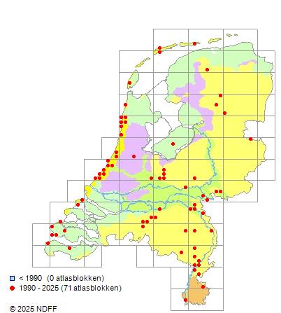 Het aantal atlasblokken (5x5 km) waarin de soort is gemeld binnen een periode van vijf jaar (vanaf 1980) of twintig jaar. Niet gecorrigeerd voor waarnemersinspanning en het aantal doorgegeven waarnemingen kan sterk variëren per periode, dus een trend in verspreiding kan hier niet direct uit worden afgelezen. Het opgegeven jaartal is het eerste jaar van de periode. Bron: gevalideerde waarnemingen uit de NDFF.