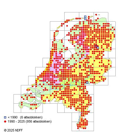 Het aantal atlasblokken (5x5 km) waarin de soort is gemeld binnen een periode van vijf jaar (vanaf 1980) of twintig jaar. Niet gecorrigeerd voor waarnemersinspanning en het aantal doorgegeven waarnemingen kan sterk variëren per periode, dus een trend in verspreiding kan hier niet direct uit worden afgelezen. Het opgegeven jaartal is het eerste jaar van de periode. Bron: gevalideerde waarnemingen uit de NDFF.
