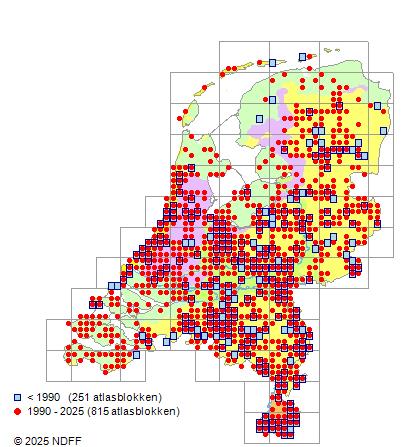 Het aantal atlasblokken (5x5 km) waarin de soort is gemeld binnen een periode van vijf jaar (vanaf 1980) of twintig jaar. Niet gecorrigeerd voor waarnemersinspanning en het aantal doorgegeven waarnemingen kan sterk variëren per periode, dus een trend in verspreiding kan hier niet direct uit worden afgelezen. Het opgegeven jaartal is het eerste jaar van de periode. Bron: gevalideerde waarnemingen uit de NDFF.