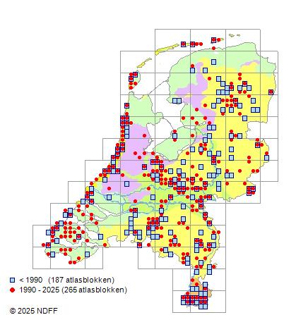 Het aantal atlasblokken (5x5 km) waarin de soort is gemeld binnen een periode van vijf jaar (vanaf 1980) of twintig jaar. Niet gecorrigeerd voor waarnemersinspanning en het aantal doorgegeven waarnemingen kan sterk variëren per periode, dus een trend in verspreiding kan hier niet direct uit worden afgelezen. Het opgegeven jaartal is het eerste jaar van de periode. Bron: gevalideerde waarnemingen uit de NDFF.