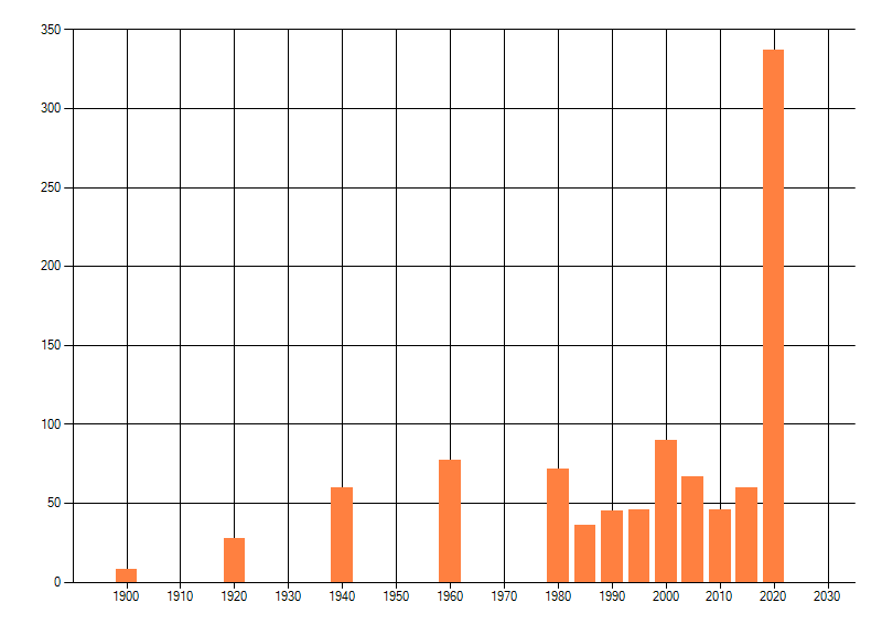 Het aantal atlasblokken (5x5 km) waarin de soort is gemeld binnen een periode van vijf jaar (vanaf 1980) of twintig jaar. Niet gecorrigeerd voor waarnemersinspanning en het aantal doorgegeven waarnemingen kan sterk variëren per periode, dus een trend in verspreiding kan hier niet direct uit worden afgelezen. Het opgegeven jaartal is het eerste jaar van de periode. Bron: gevalideerde waarnemingen uit de NDFF.