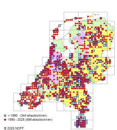 Het aantal atlasblokken (5x5 km) waarin de soort is gemeld binnen een periode van vijf jaar (vanaf 1980) of twintig jaar. Niet gecorrigeerd voor waarnemersinspanning en het aantal doorgegeven waarnemingen kan sterk variëren per periode, dus een trend in verspreiding kan hier niet direct uit worden afgelezen. Het opgegeven jaartal is het eerste jaar van de periode. Bron: gevalideerde waarnemingen uit de NDFF.
