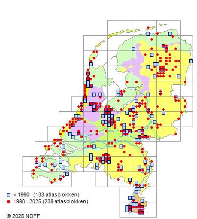 Het aantal atlasblokken (5x5 km) waarin de soort is gemeld binnen een periode van vijf jaar (vanaf 1980) of twintig jaar. Niet gecorrigeerd voor waarnemersinspanning en het aantal doorgegeven waarnemingen kan sterk variëren per periode, dus een trend in verspreiding kan hier niet direct uit worden afgelezen. Het opgegeven jaartal is het eerste jaar van de periode. Bron: gevalideerde waarnemingen uit de NDFF.